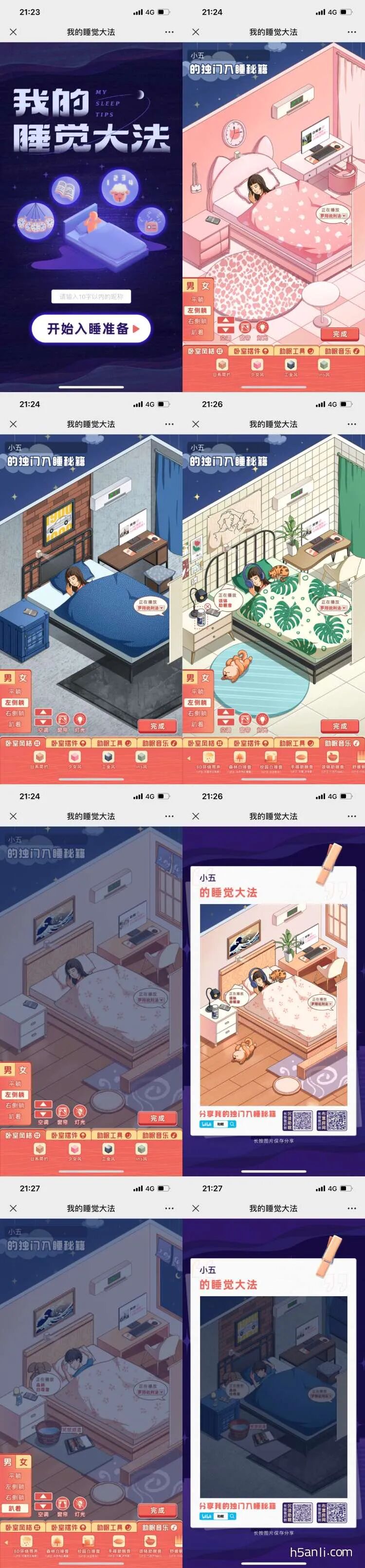 情景布置类作品,用户在作品中选择选择性别和入睡姿势,房间风格,调整空调温度,窗帘开关和灯光明暗,打开下方菜单给房间添加卧室摆件,助眠工具,选择助眠音乐,还原自己入睡时的样子,生成海报,海报上有音乐搜索关键词和作品二维码。