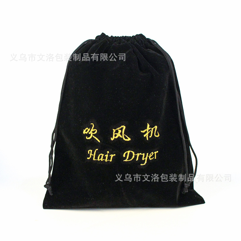 工厂现货批发黑色刺绣绒布袋束口抽绳袋吹风机包装袋25*30cm定制