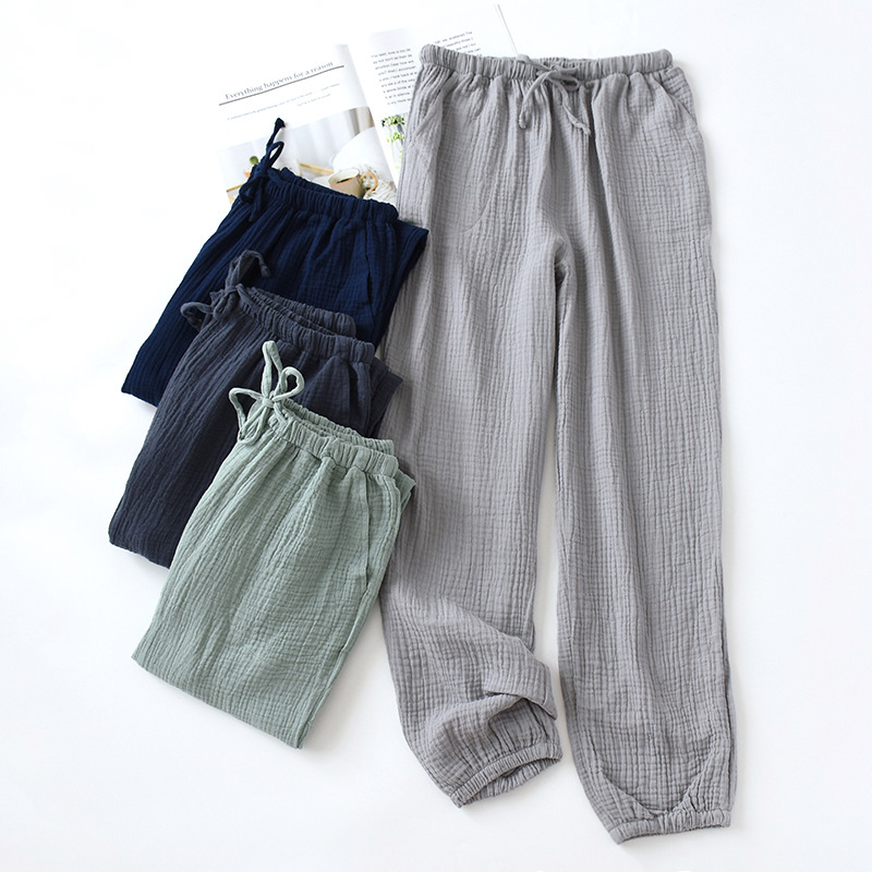 水洗纯棉纱布男士睡裤长裤收口薄款透气做旧绉布全棉家居裤春秋季