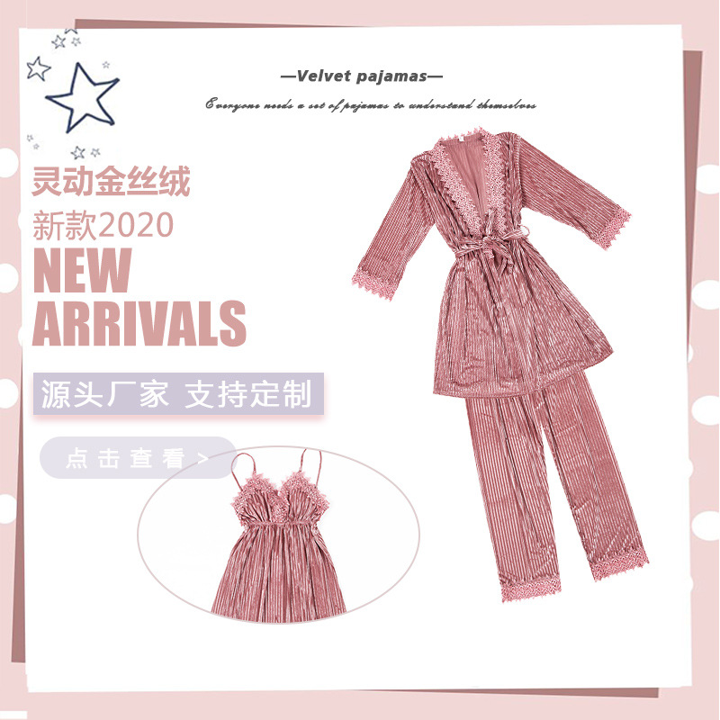 2021新款厂家直供女式长袖居家服四件套时尚高贵金丝绒女睡衣套装