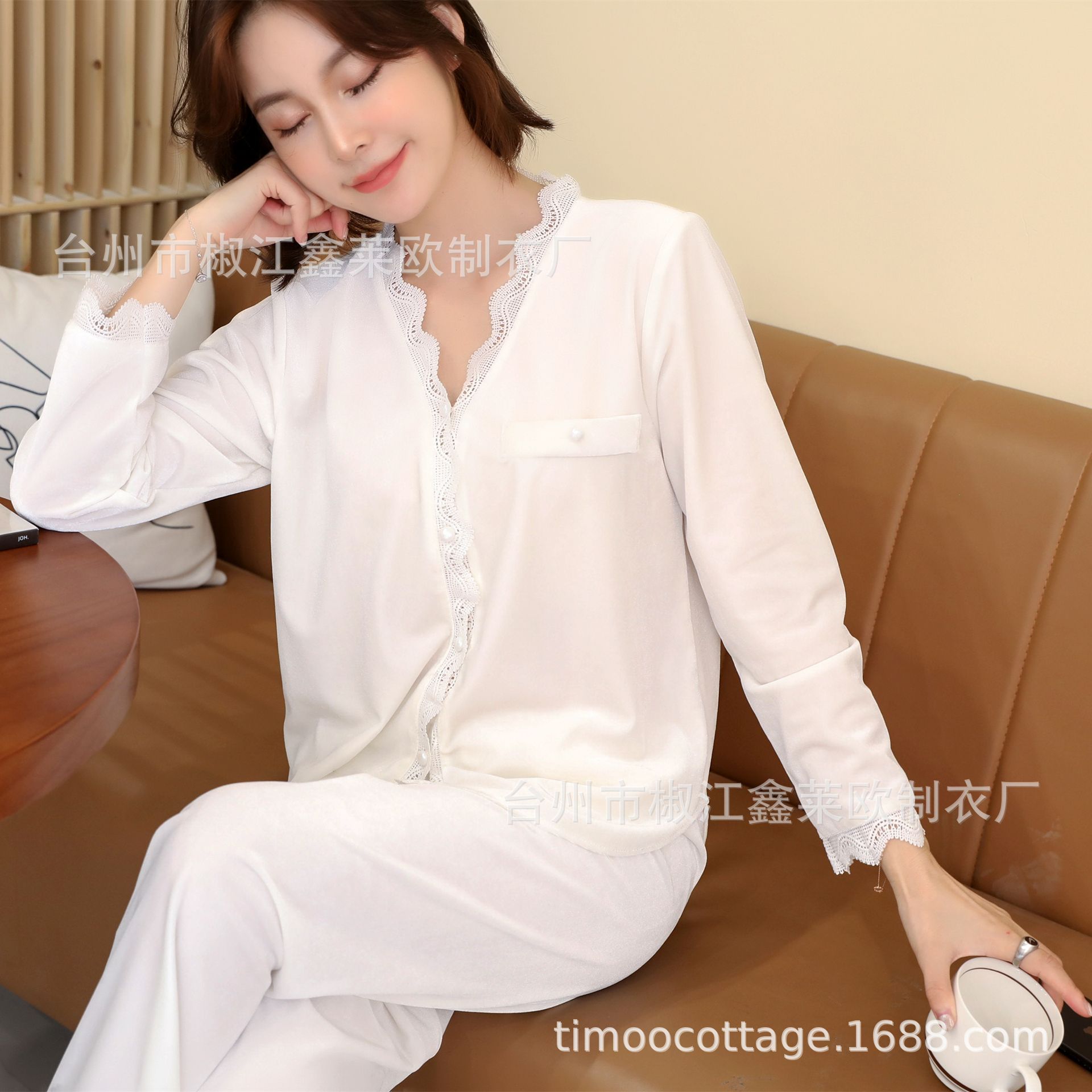 2020新款金丝绒睡衣女士秋冬长袖长裤套装小香风蕾丝边家居服韩版