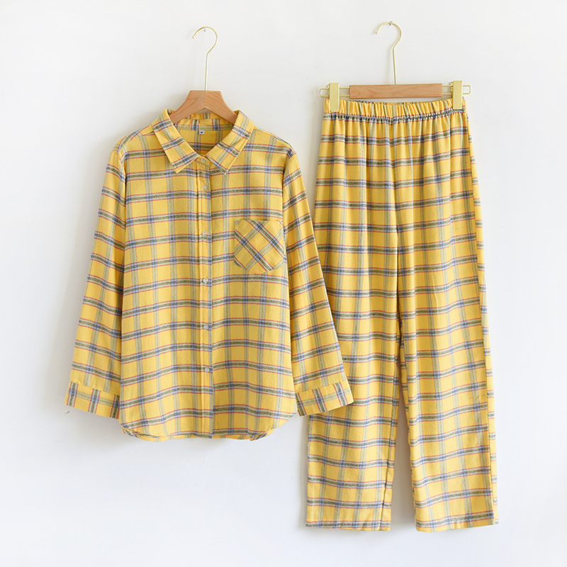 文艺格子磨毛睡衣套装 棉绒布春秋女士色织开衫长袖家居服套装