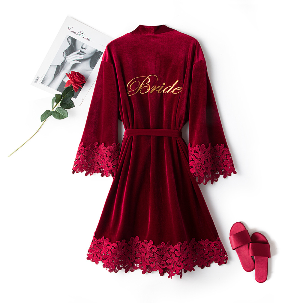2020秋冬金丝绒新娘伴娘婚庆晨袍蕾丝边可定制伴手礼结婚睡袍