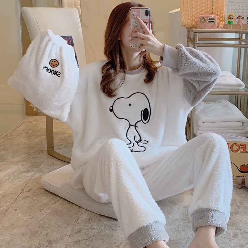 珊瑚绒睡衣女秋冬季加绒加厚暖暖套装长袖卡通布袋家居服pajamas