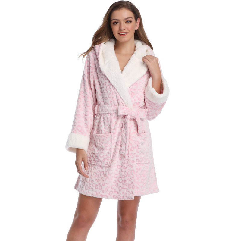 速卖通亚马逊跨境专供2019秋冬女士豹纹珊瑚绒长袖带帽浴袍家居服