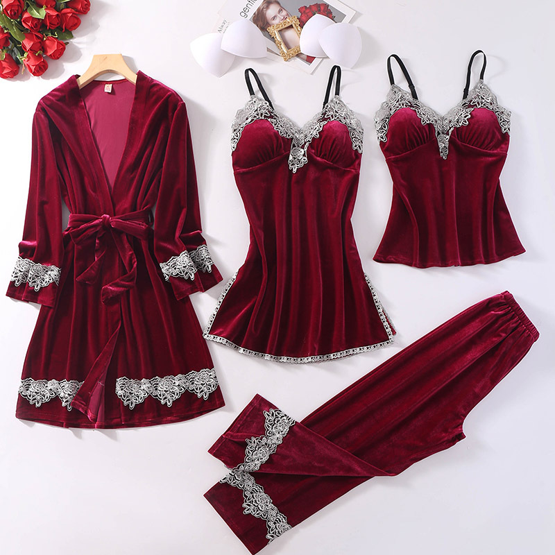 韩版金丝绒睡衣女士春秋季条纹性感吊带睡袍四件套长袖家居服套装
