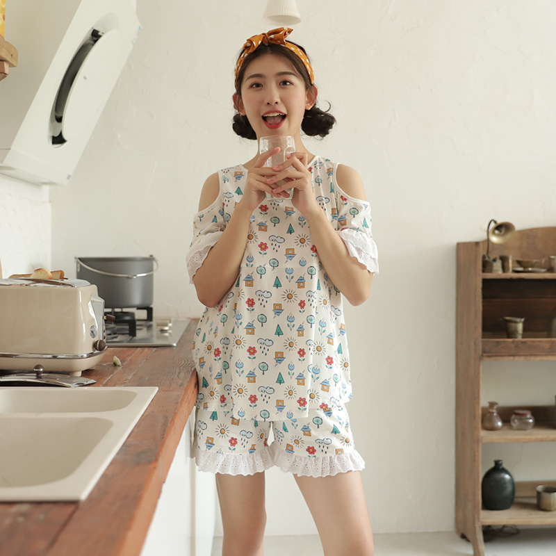 2020新款棉布露肩家居服 宽松可爱印花睡衣舒适家居服套装批发