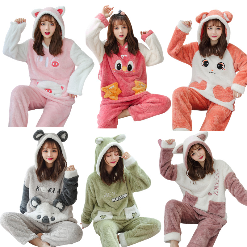 冬季睡衣女长袖连帽法兰绒甜美卡通长毛绒学生加厚保暖家居服套装