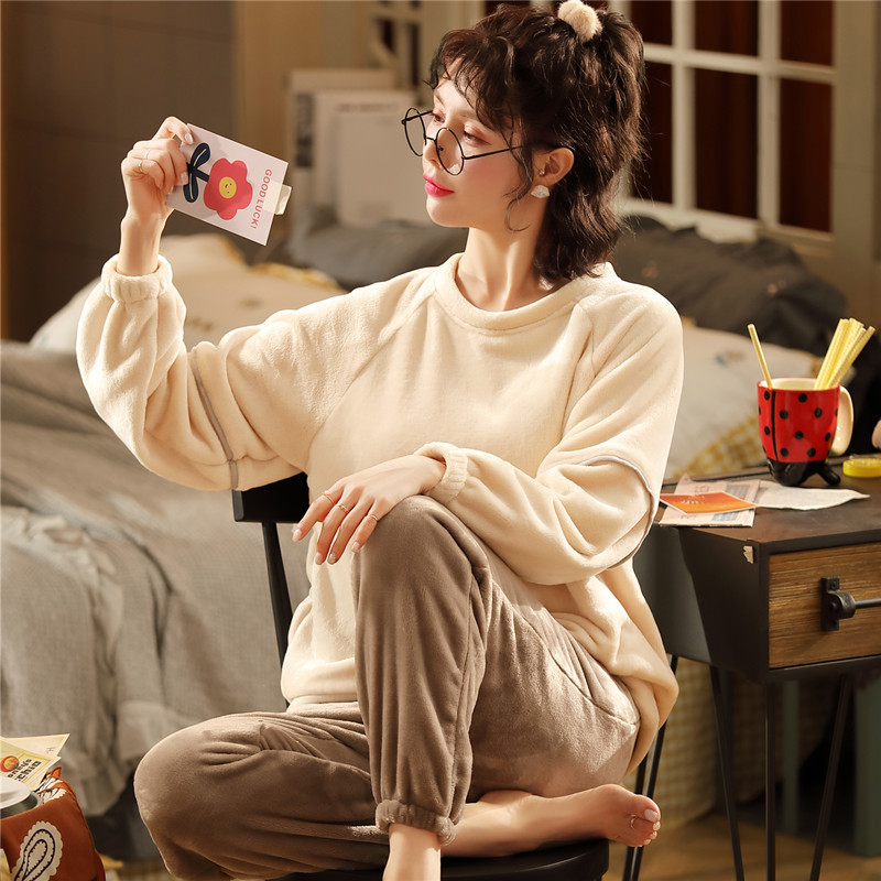 新款秋冬季法兰绒睡衣女式可爱卡通圆领加厚珊瑚绒套头休闲家居服