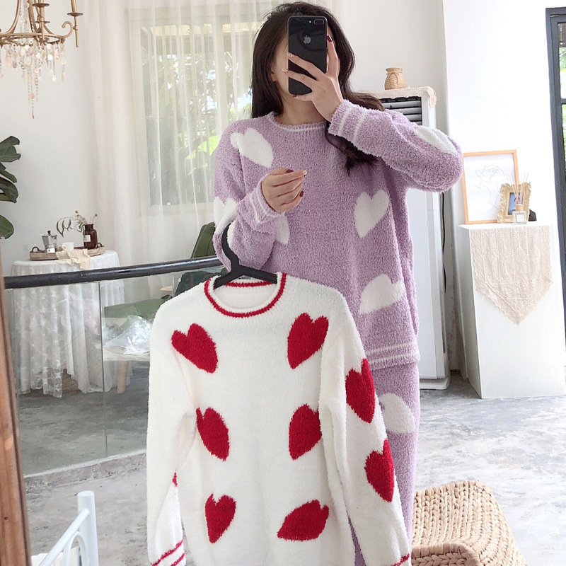 软绵绵韩版冬季长袖保暖可爱甜美半边绒可外穿睡衣女冬家居服套装