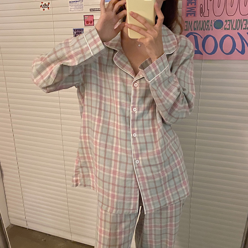 2020秋季新款ns粉绿格子睡衣柔软棉布秋冬家居服套装女