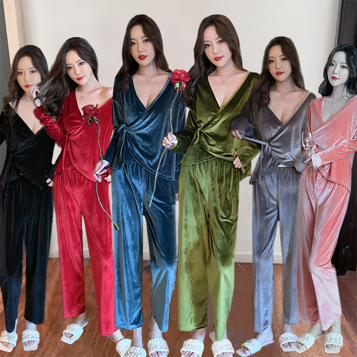睡衣女 秋冬季新款韩版金丝绒和服开襟系绳纯色性感宽松家居服