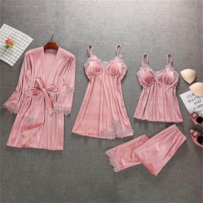 性感蕾丝花边睡衣女长袖长裤吊带四件套金丝绒带胸垫家居服套装