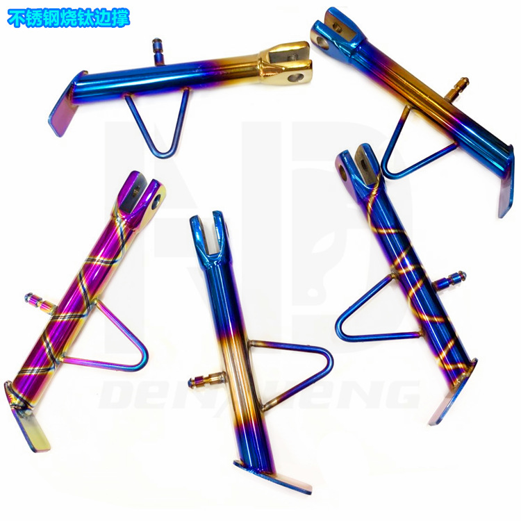 摩托车改装304不锈钢侧脚架 电摩踏板车烧钛色边撑配弹簧边脚架