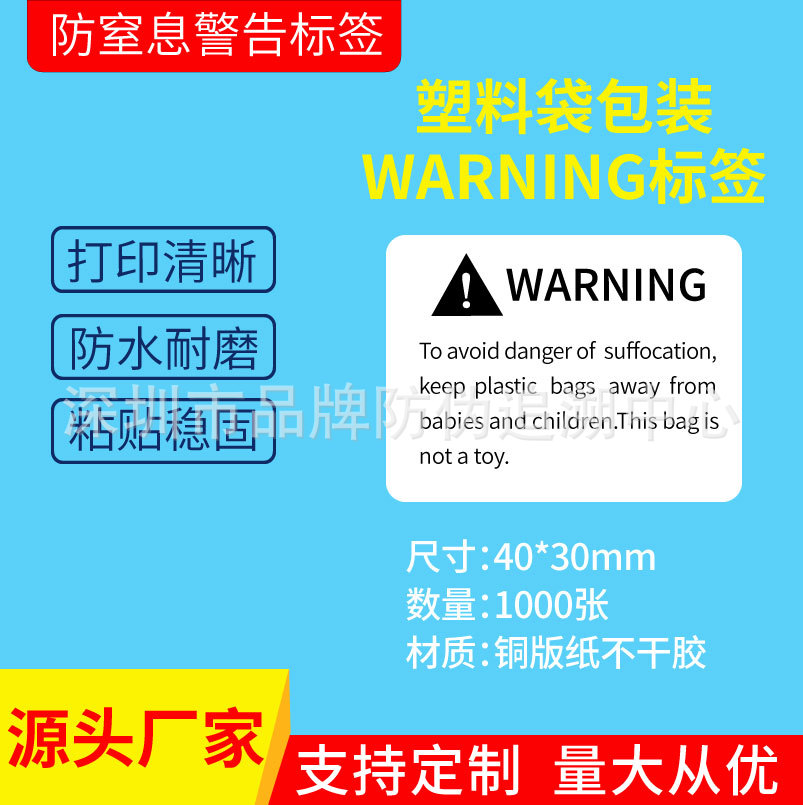 亚马逊FBA防窒息警告标签 白底黑字英文防窒息标签50*30 50*50mm