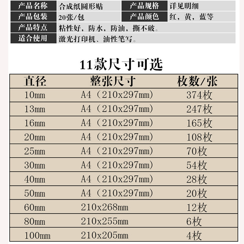 彩色圆点不干胶标签激光打印纸PET防水撕不破圆形贴纸logo