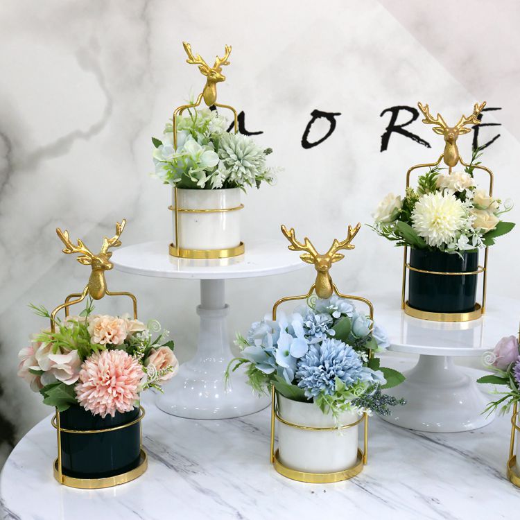 涵旅创意鹿头镀金铁艺陶瓷花盆仿真花装饰桌面茶几橱窗装饰摆件