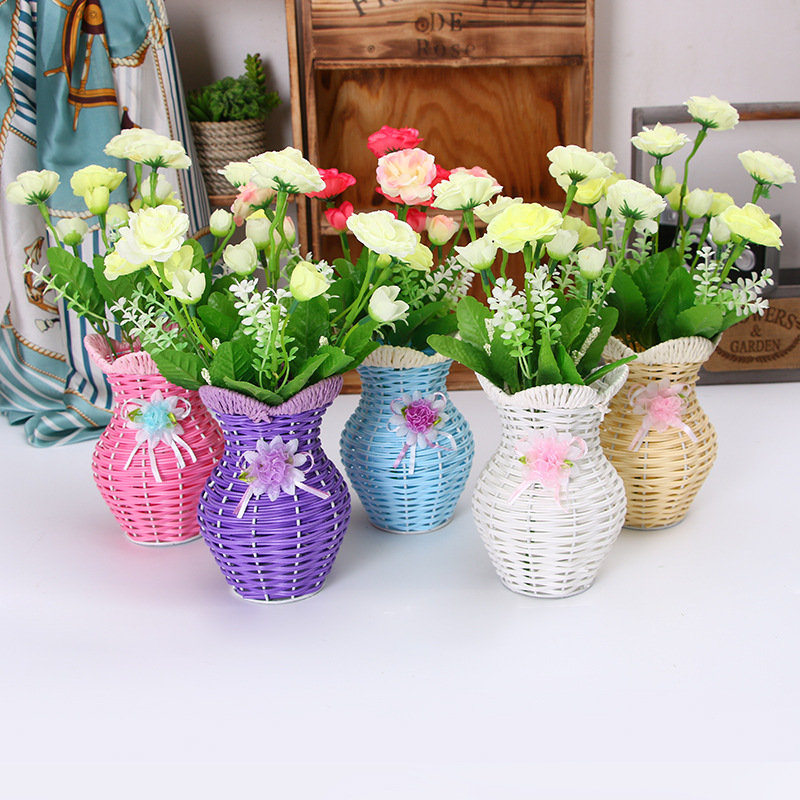 家居藤编花篮 手工塑料小花篮 桌面梅花口塑料花瓶摆饰厂家批发