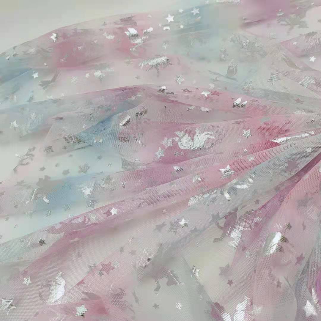 2021年新款36A印彩虹网纱布料六角网眼渐变烫金数码印花服装面料
