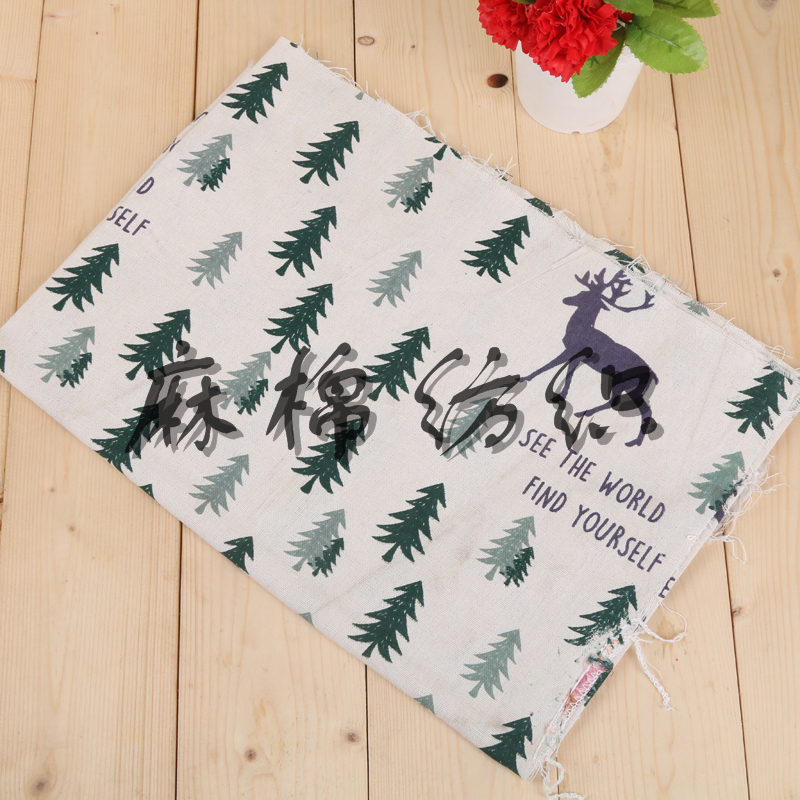树木印花麻布 田园风服装布料 手工DIY背景布