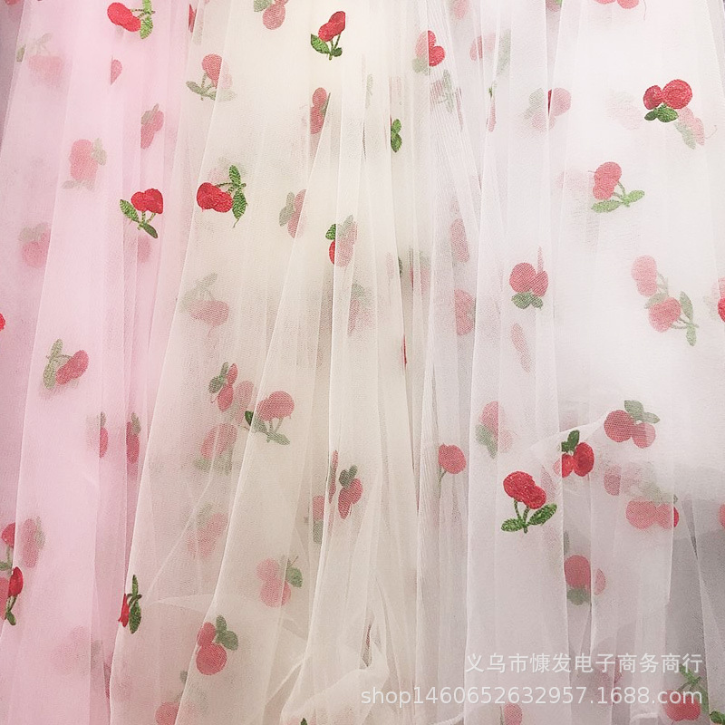 爆款3D立体尼龙加强网纱绣花樱桃布料DIY童装女装连衣裙刺绣面料