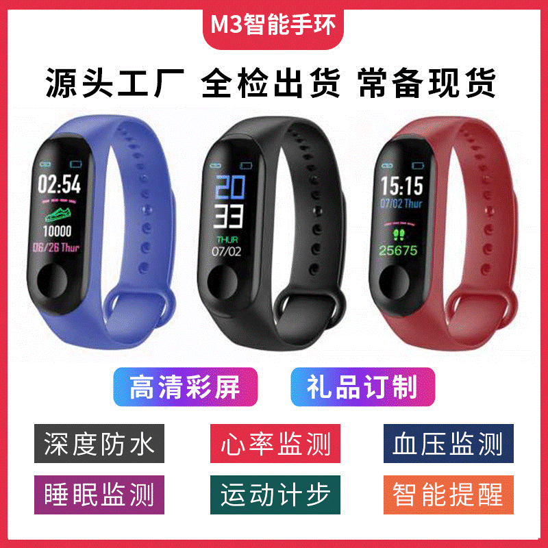 新款M3彩屏智能手环M3监测3代IP68防水心率血压睡眠线充直充礼品1