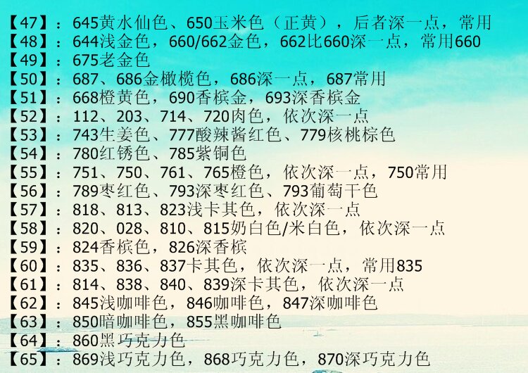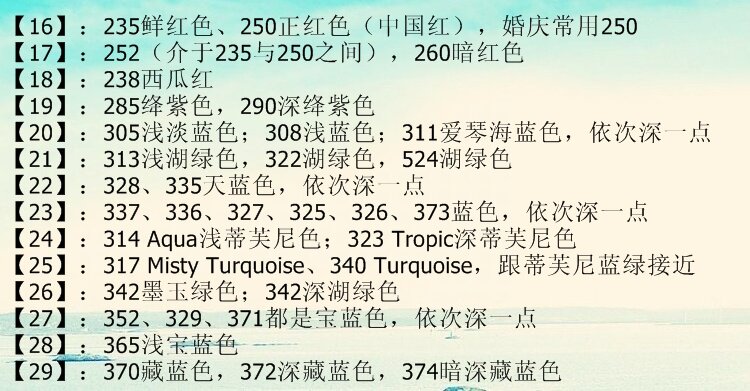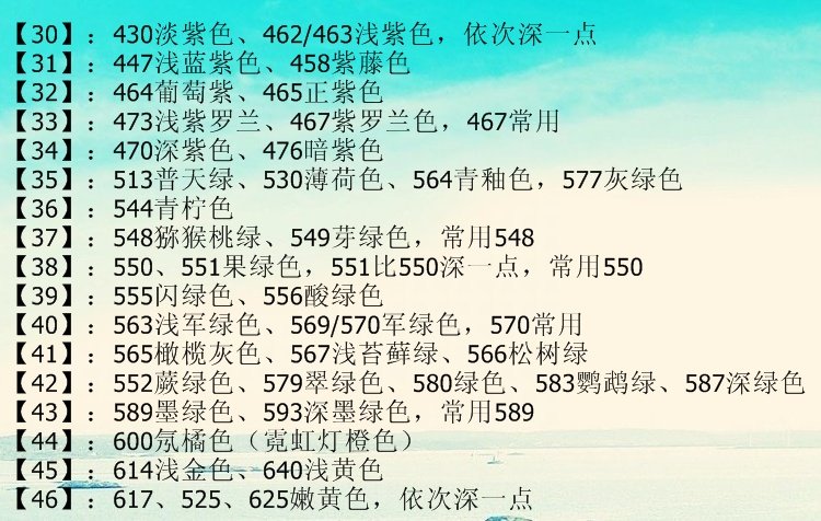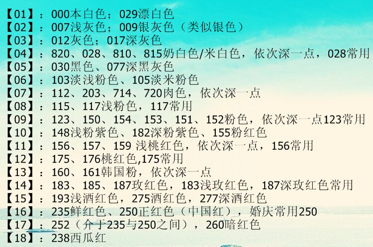 颜色的色块在上,相对应的颜色编号说明(数字+英文)在下