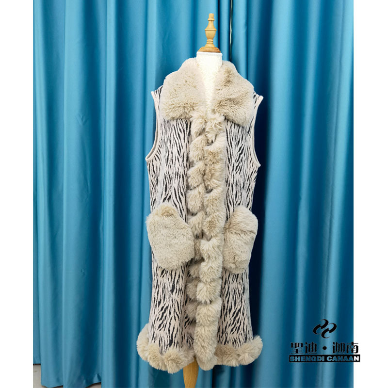 2021秋冬欧美气质毛领串毛斑纹口袋保暖长款宽松马甲妈妈披肩