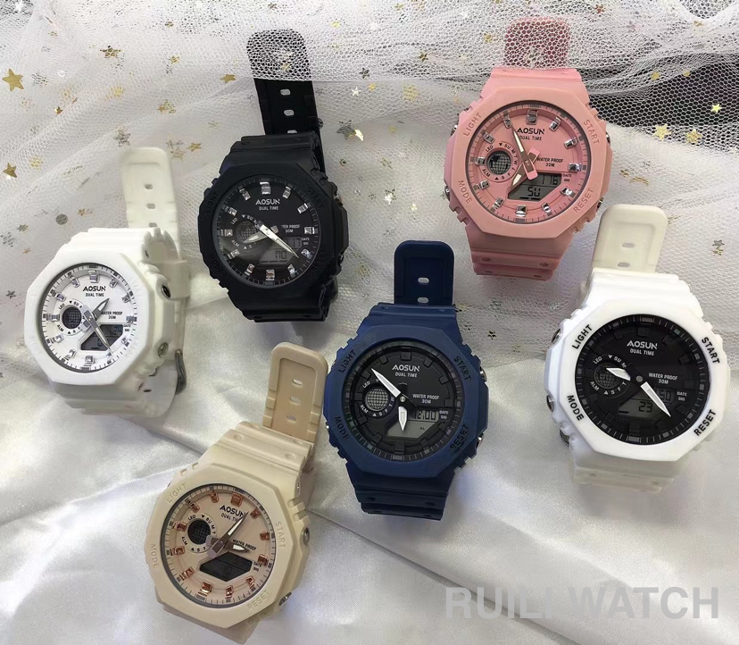 电商热销网红爆款双机芯电子表Aosun-907防水学生运动时尚手表批