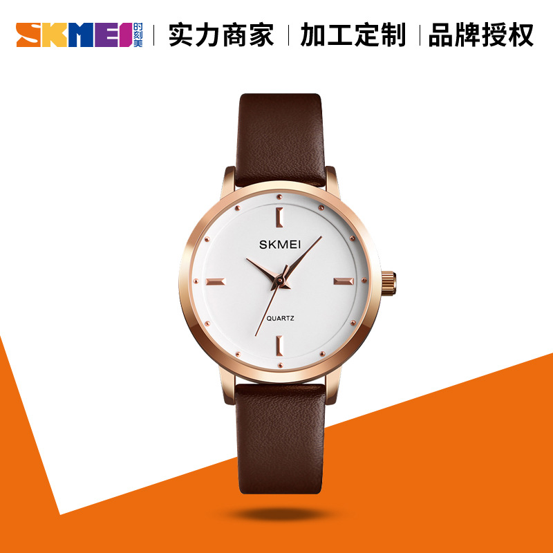 skmei商务时尚女士真皮表带石英表锌合金玫瑰金简约表盘女款手表