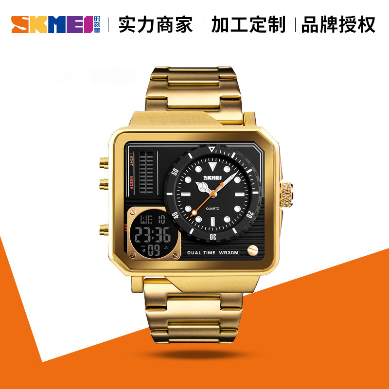 时刻美时尚休闲手表 东南亚外贸货源钢表带土豪金方形双显电子表