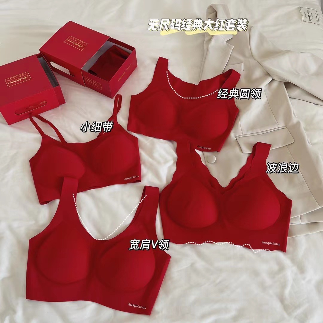 无尺码onesize大红开运锦鲤套装女无钢圈小细带V领圆领乳胶内衣女