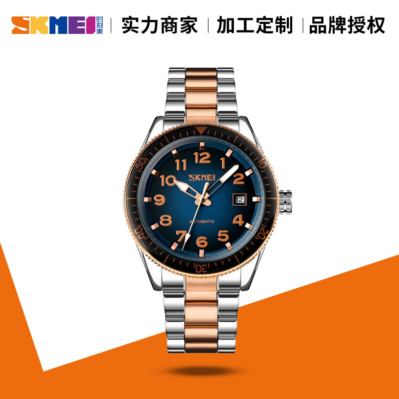 时刻美间金钢带商务自动机械表 镂空经典弧形玻璃日历窗夜光手表