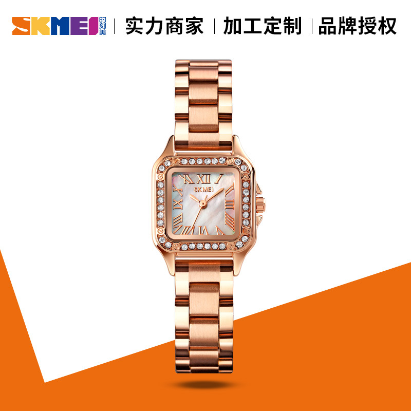 时刻美珍珠母贝表盘方形时尚腕表 女士实心钢带优雅镶钻石英手表