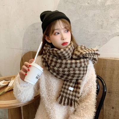 新款仿羊绒格子围巾女冬季长款保暖女式围巾围脖流苏两用披肩批发