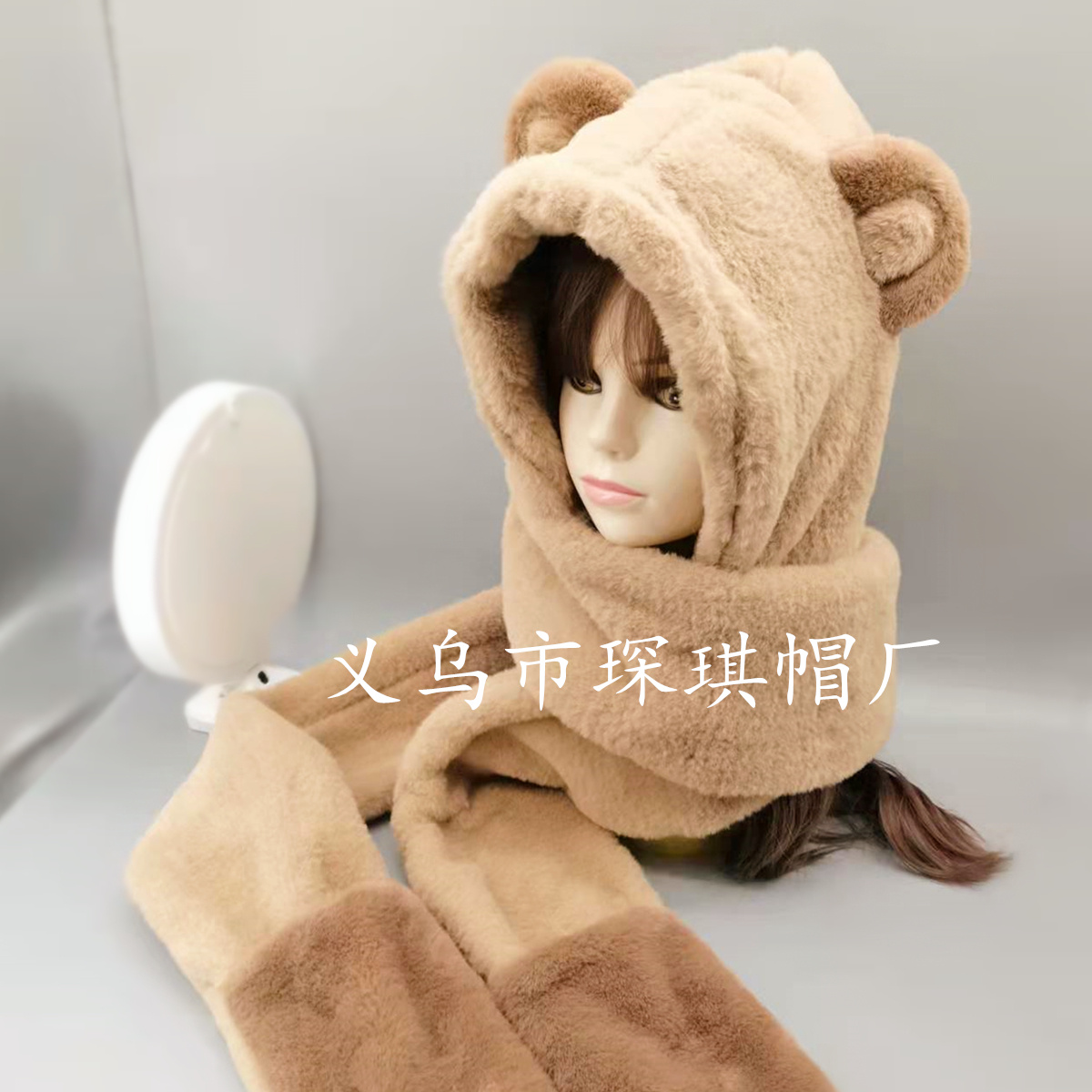 卡通帽子围巾手套一体三件套毛绒加厚保暖连体帽