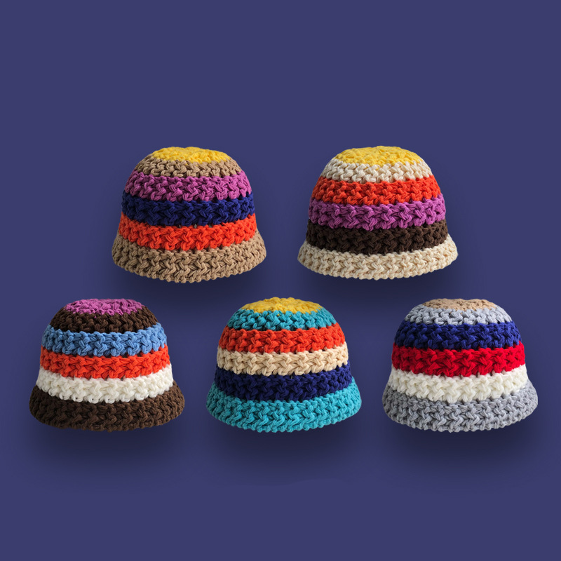 彩虹盆帽日系ins手工针织渔夫帽子女秋季保暖韩版条纹毛线帽冬天