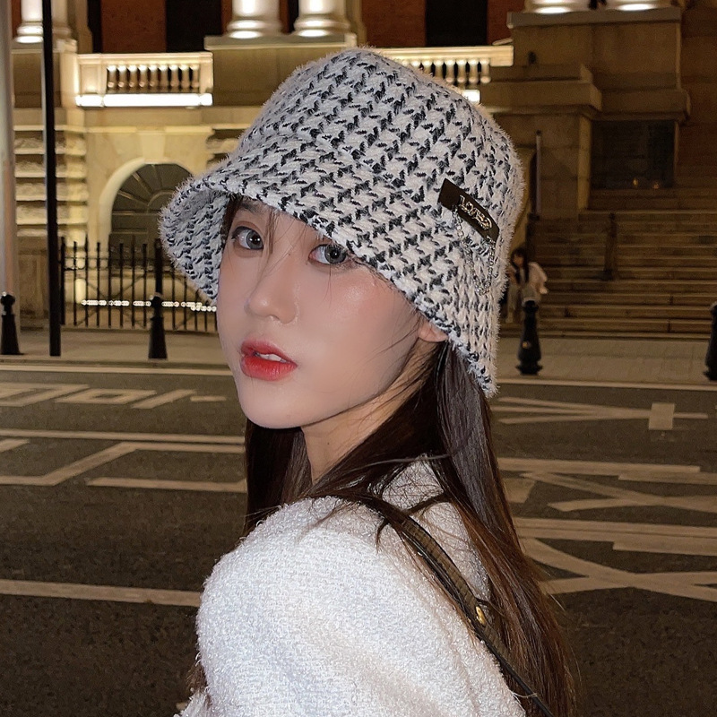 格子渔夫帽女卡其黑白格纹水桶帽女士秋冬毛呢盆帽子小众潮流休闲