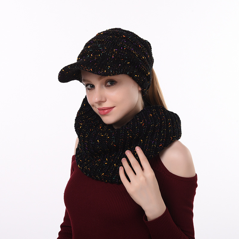 秋冬欧美风格加檐点纱针织帽围巾两件套户外出行保暖套装厂家直供