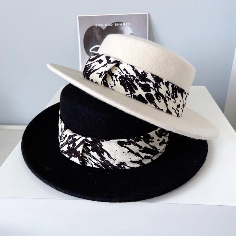 欧美澳洲羊毛毡帽子女秋冬平顶礼帽文艺涂鸦缎带盆帽纯色时装帽潮