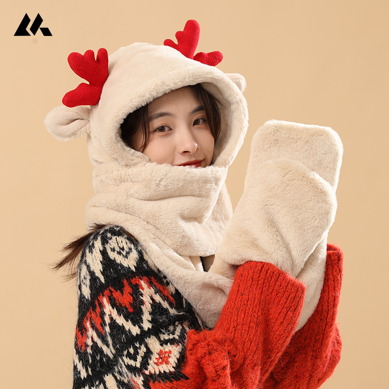 帽子女秋冬围巾一体可爱圣诞麋鹿韩版潮雷锋帽冬手套三件套护耳帽