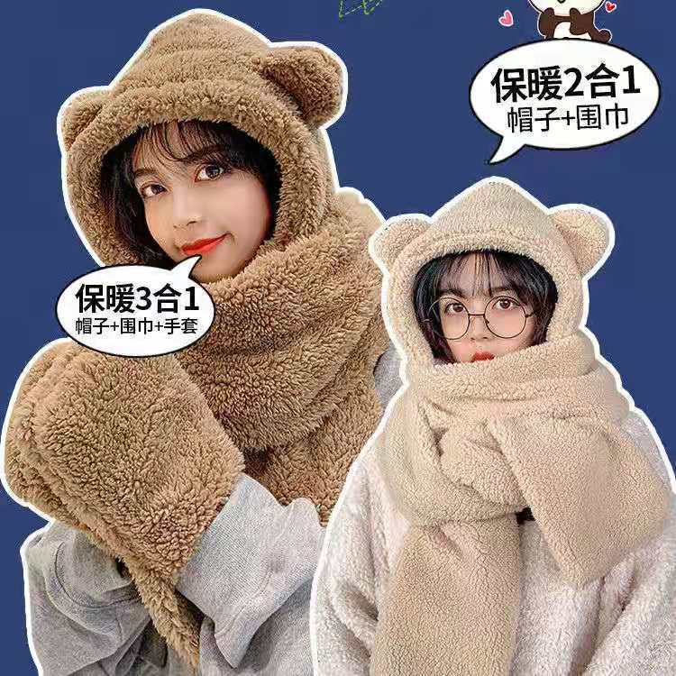 帽子手套围巾一体三件套熊耳朵帽子秋冬户外加厚女亲子帽围脖女男