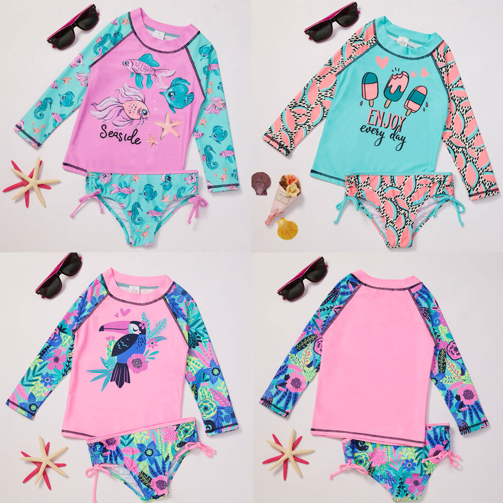 2022新款女童分体泳衣跨境爆款分体长袖儿童泳衣多色印花女童泳衣