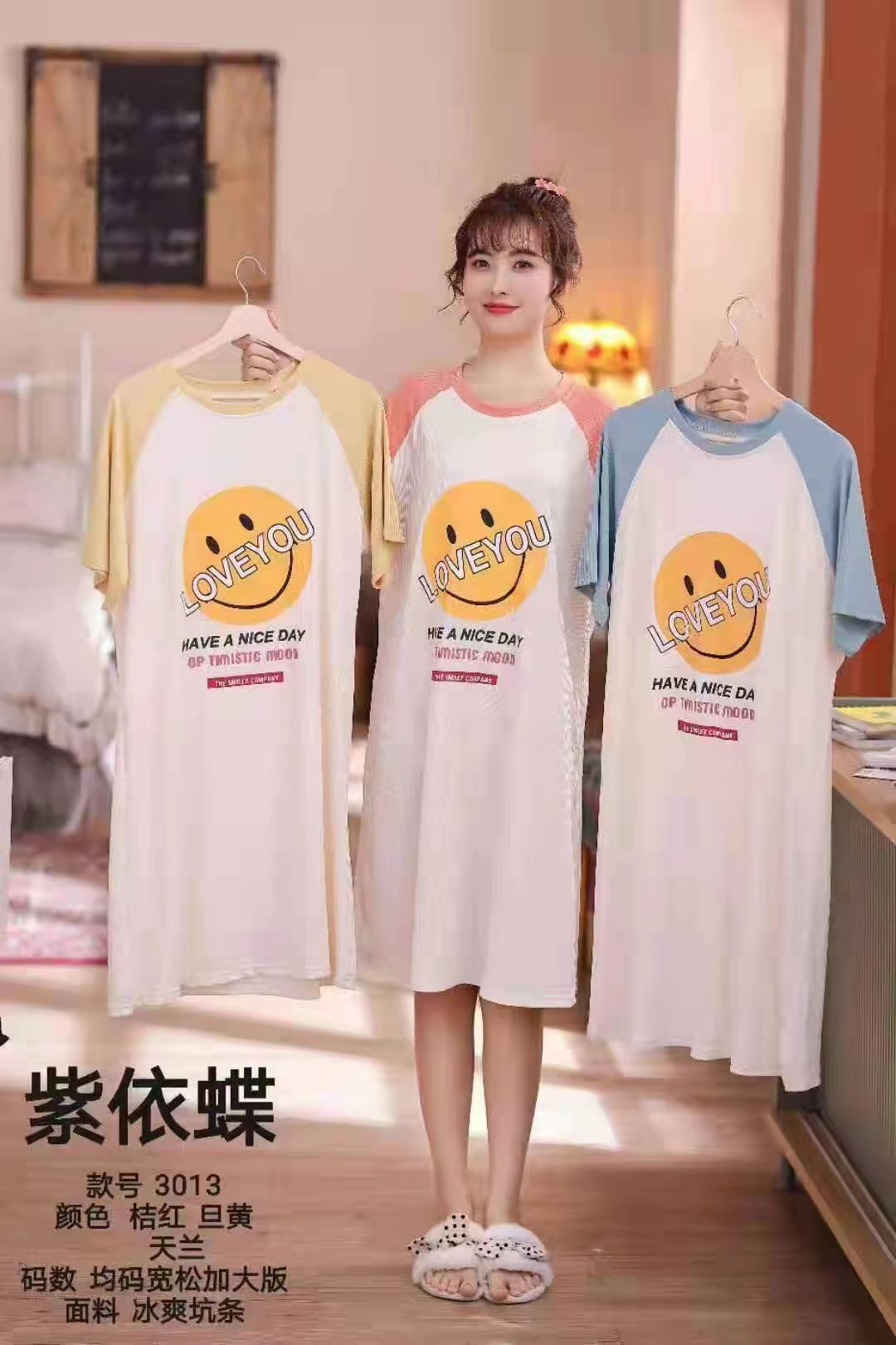 短袖女士夏季睡裙薄款纯棉冰爽罗纹条印花短袖可爱大码裙子家居服