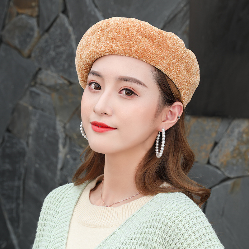 2021秋冬新款雪尼尔贝雷帽 韩版复古休闲甜美画家南瓜帽女