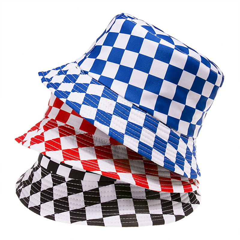2022春夏款原宿风黑白格子渔夫帽女街头百搭遮阳帽可折叠盆帽批发