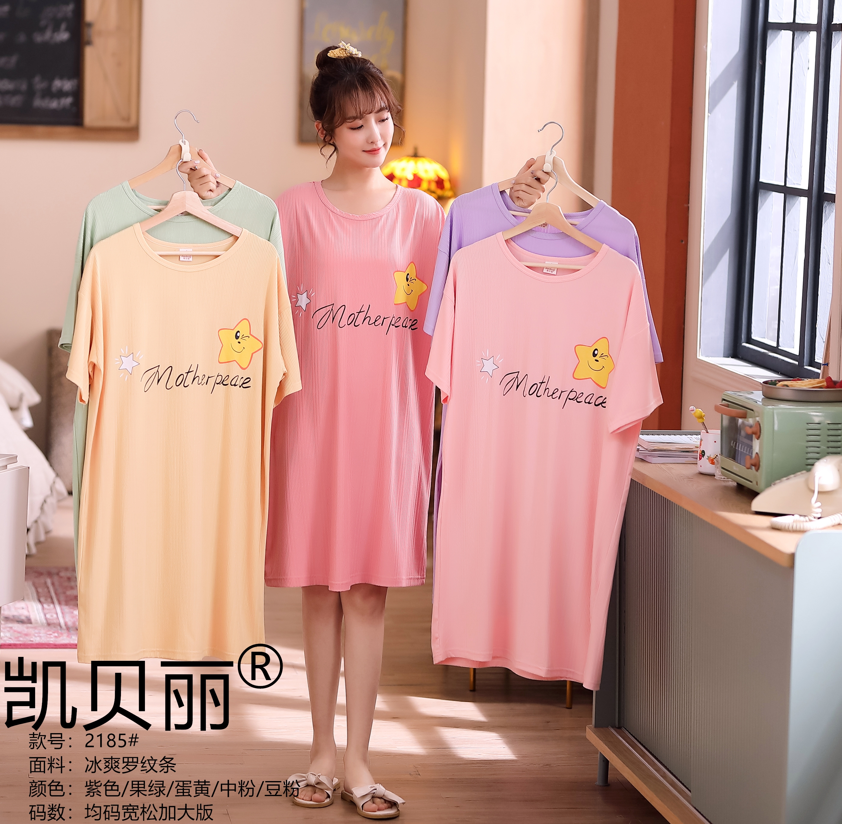 短袖女夏季睡裙薄款纯棉冰爽罗纹条印花短袖可爱大码裙子家居服