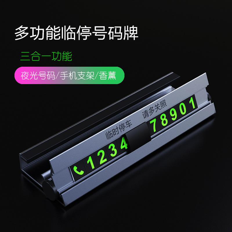 汽车临时停车号码牌 三合一车载手机支架铝合金款挪车电话牌