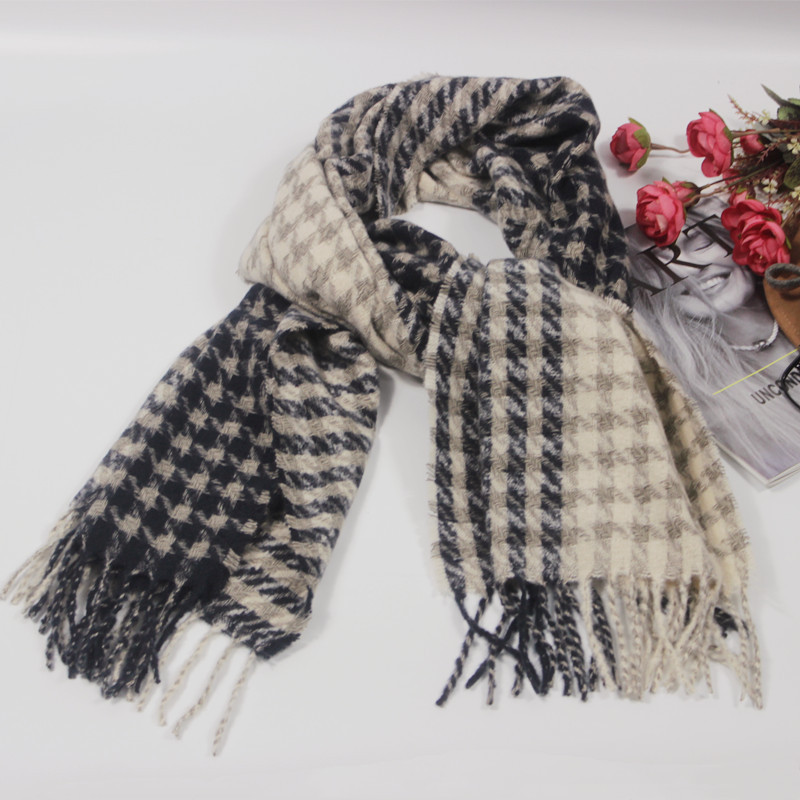 外贸新款双色千鸟格圈圈纱仿羊绒披肩欧美秋冬百搭中性保暖厚围巾