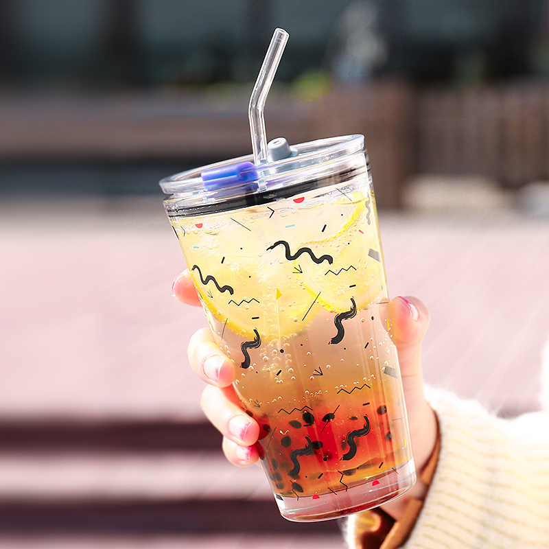 INS网红杯刻度玻璃杯玻璃吸管密封水杯奶茶